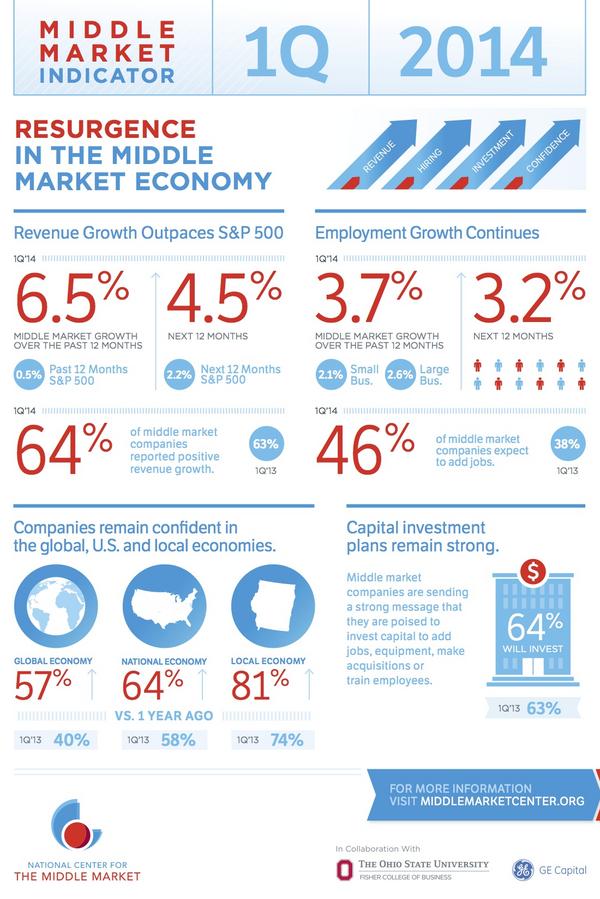 The National Center for the Middle Market, a collaboration of the Ohio State University Fisher College of Business and GE Capital, conducted a survey on the country’s middle market, which is made up of approximately 200,000 businesses with $10 million to $1 billion in revenue. Findings showed that these companies had more than $10 trillion total in annual revenue and created 1.2 million new jobs in 2012–2013.